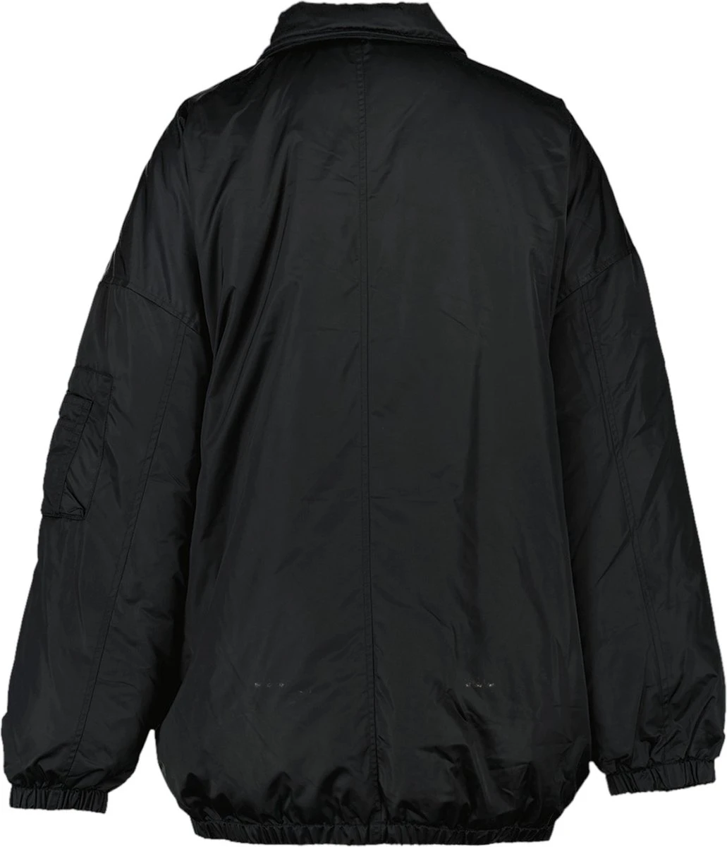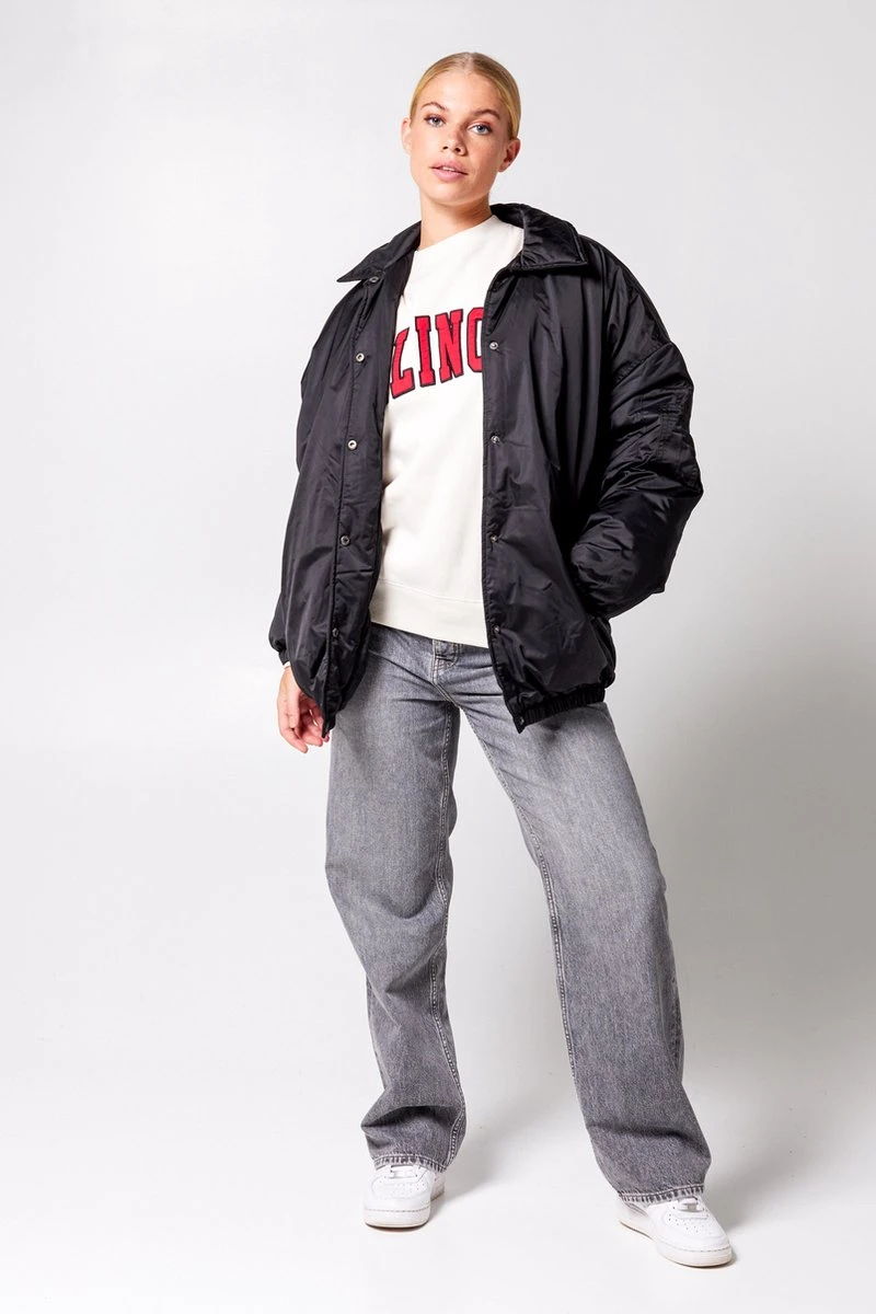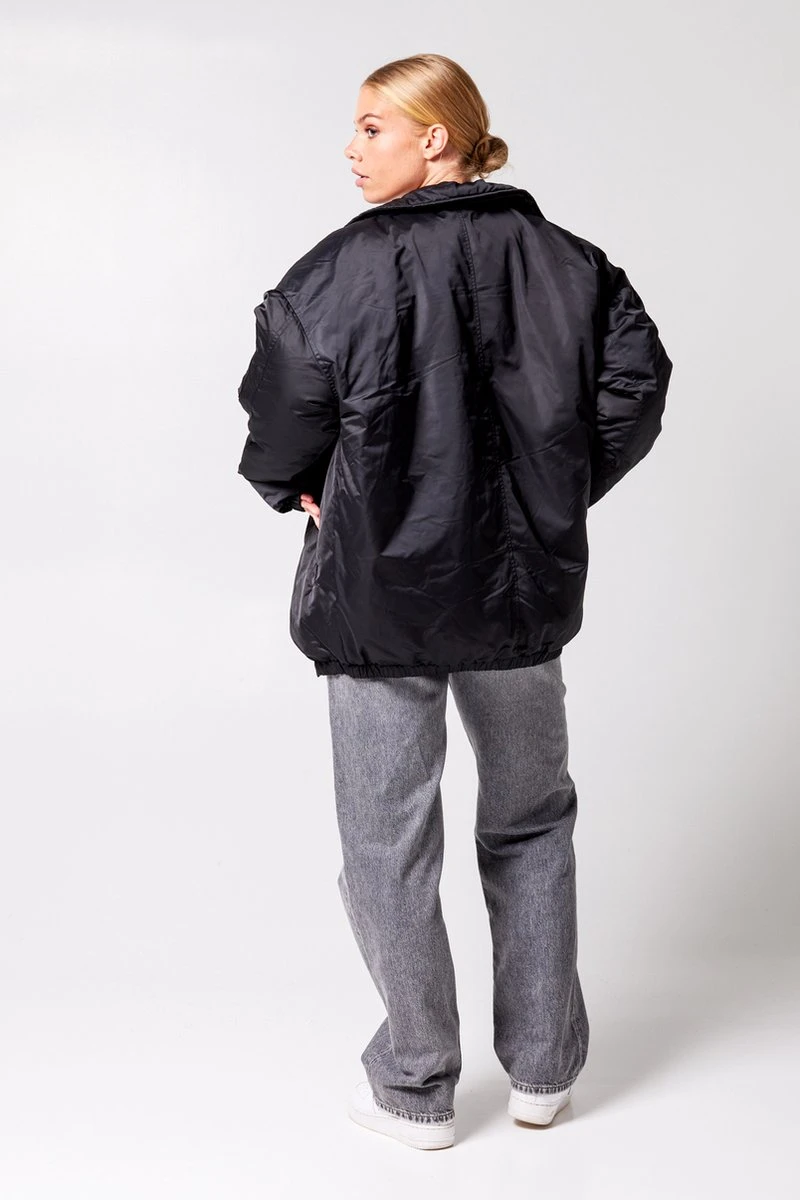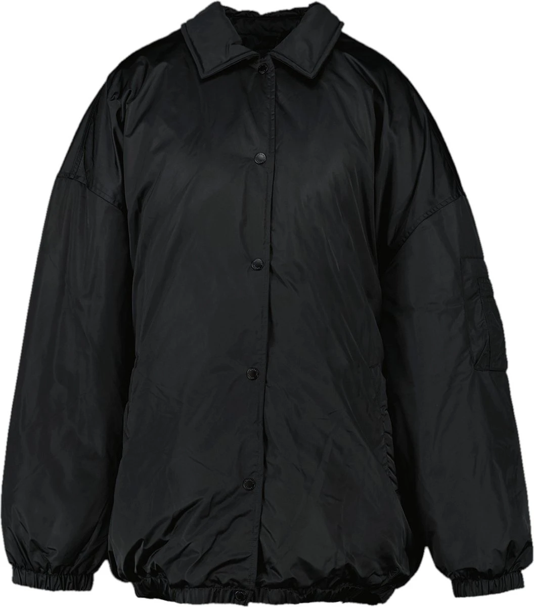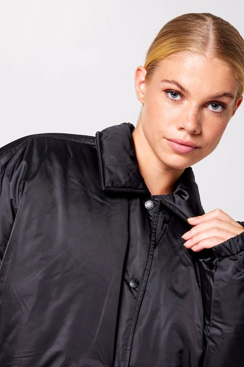America Today dames winterjas. De Jailey oversized coach jacket heeft een overslag kraag en een drukknoopsluiting. De jas heeft steekzakken en is gemaakt van een gladde glanzende stof.