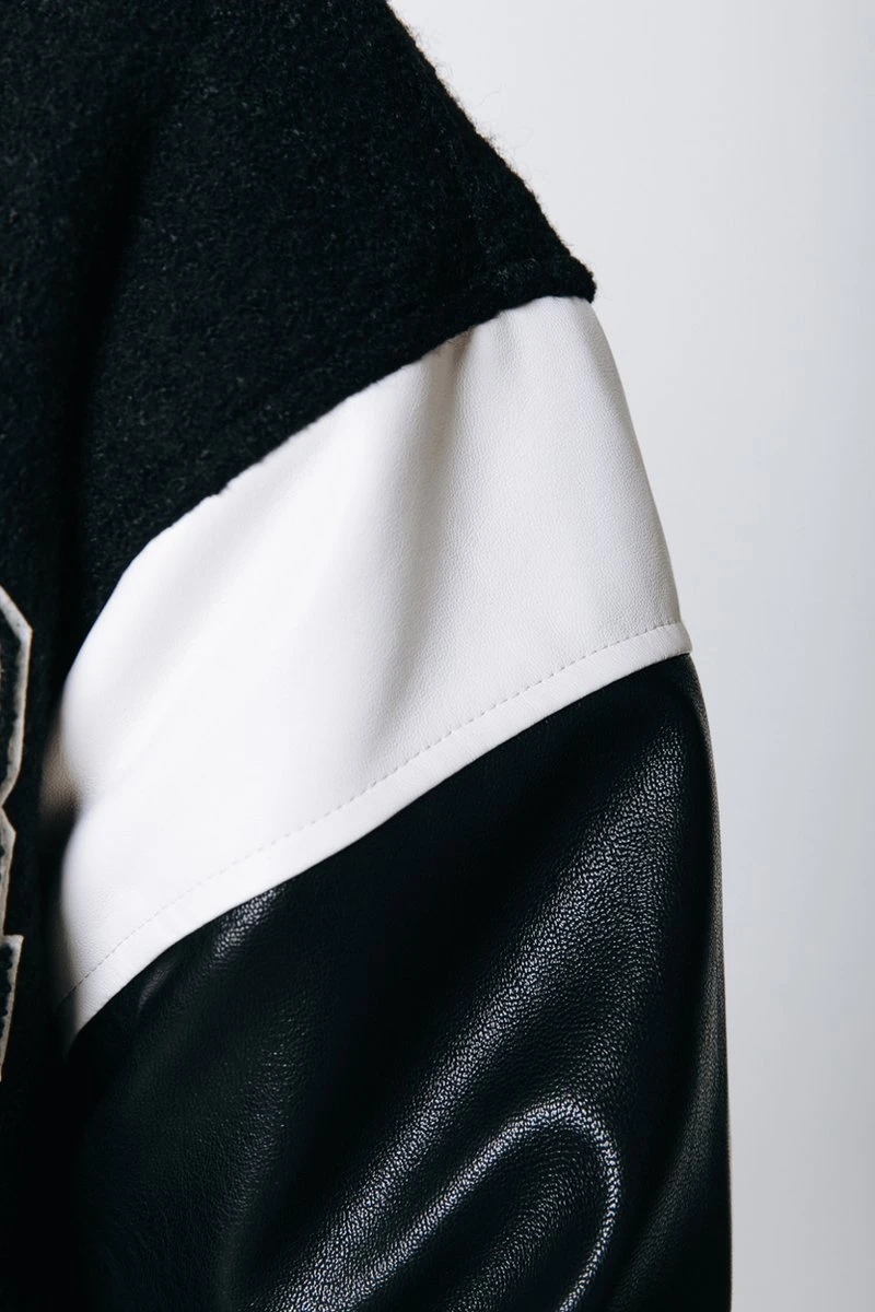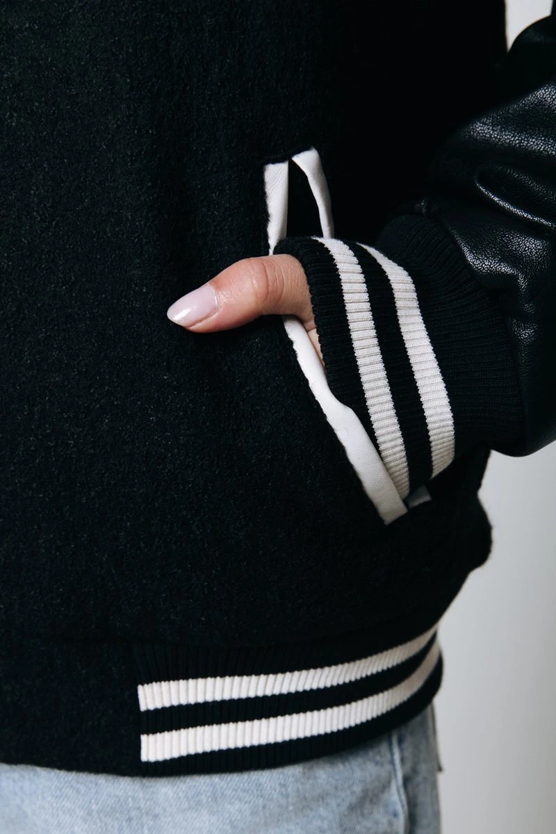 Bomber jacketBoxy fitRegular lengteLange mouwRitssluiting voorkantSteekzakkenZowel ritssluiting als drukknoopsluiting60% viscose, 40% woolNon stretch stofStomerij reinigingModel is 1.70m en draagt S