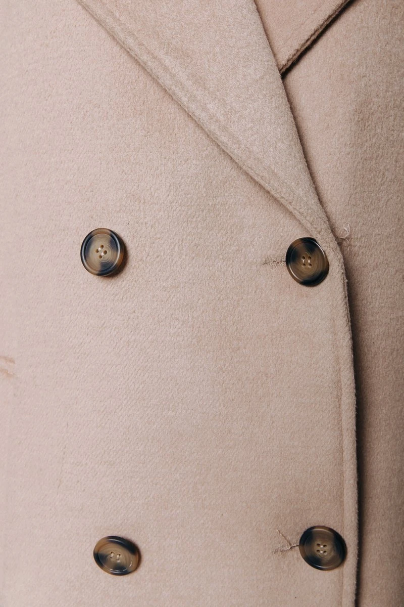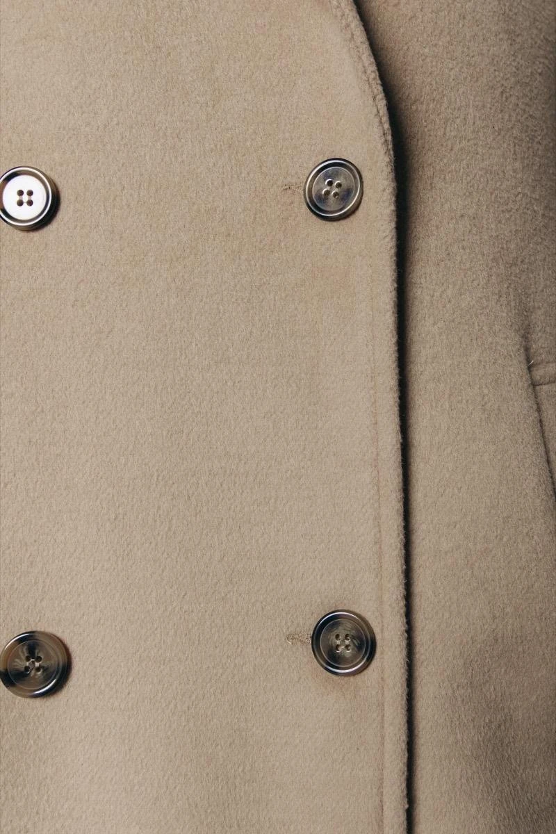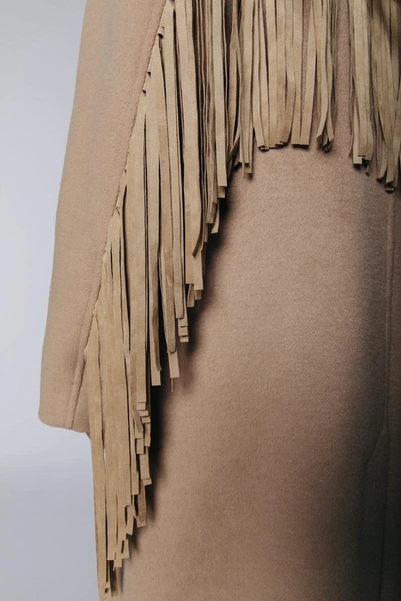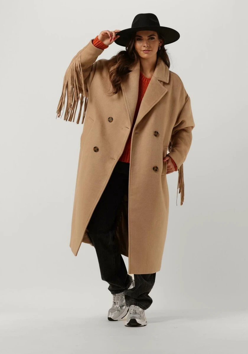 Long coatOversized fitLangere lengteLange mouwKnoopsluitingSteekzakkenDe jas heeft fringe details op de rug en mouwen70% polyester, 30% woolNon stretch stofStomerij reinigingModel is 1.70m en draagt S