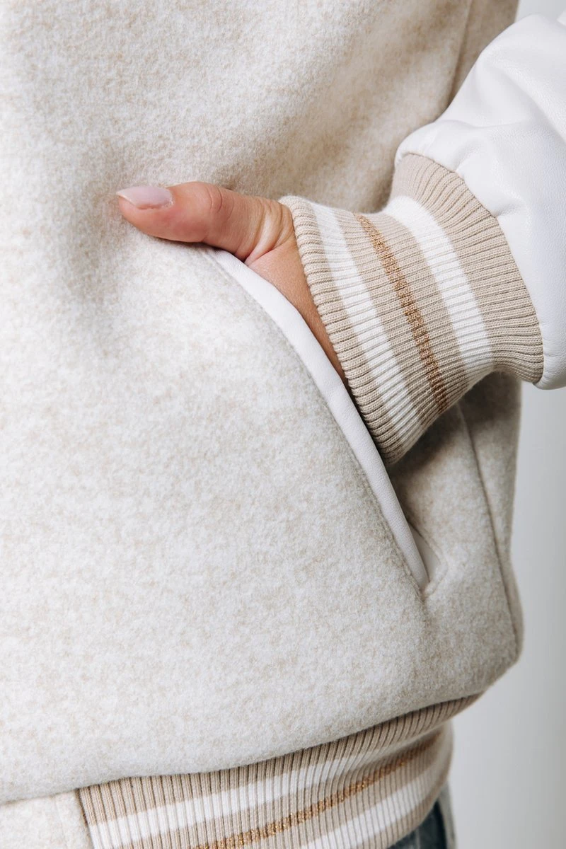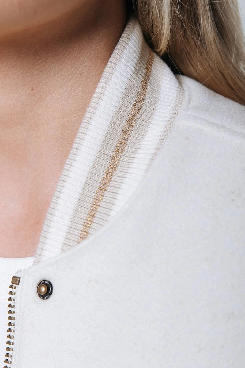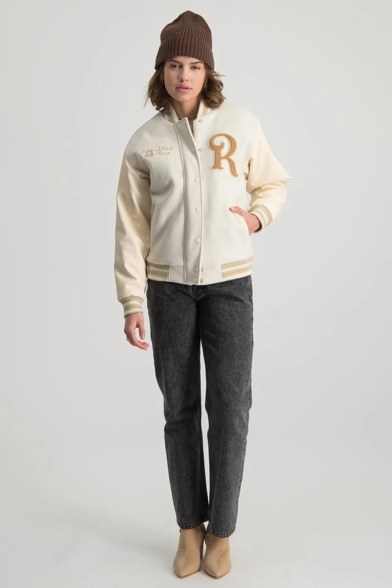 Bomber jacketBoxy fitRegular lengteLange mouwMetalen ritssluiting voorkantSteekzakkenZowel ritssluiting als drukknoopsluiting80% polyester, 20% viscoseNon stretch stofStomerij reinigingModel is 1.70m en draagt S