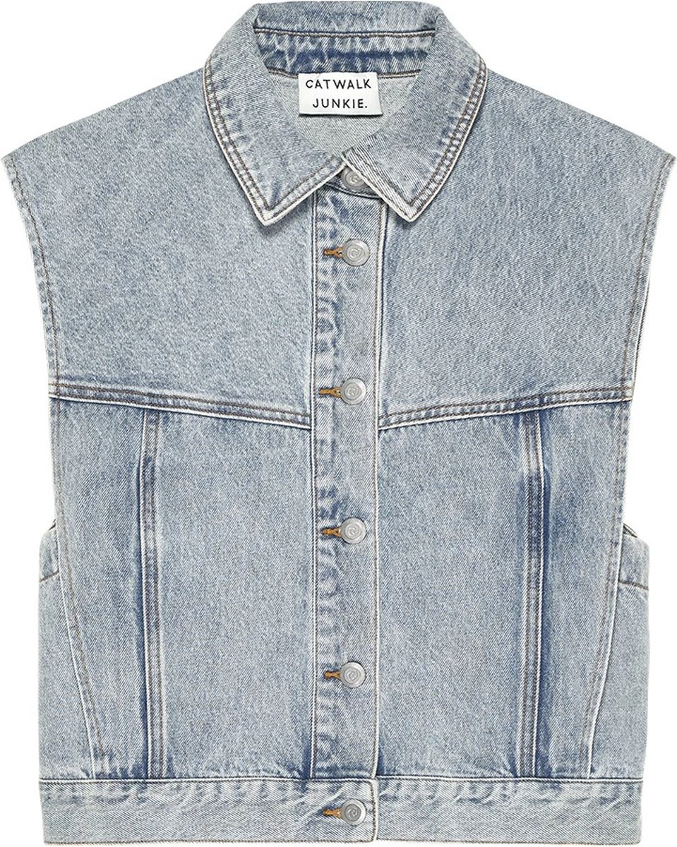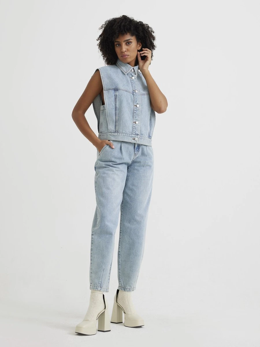 Deze ‘Mae’ denim gilet is uitgevoerd in een lichtblauwe wassing en heeft een normale pasvorm met iets rechte schouders. De mouwloze stijl heeft gegraveerde knopen aan de voorzijde en een puntkraag. Gemaakt van gerecycled en conventioneel katoen.