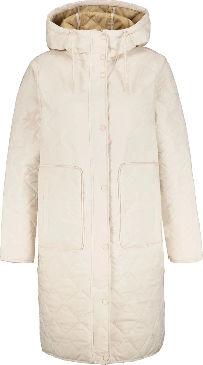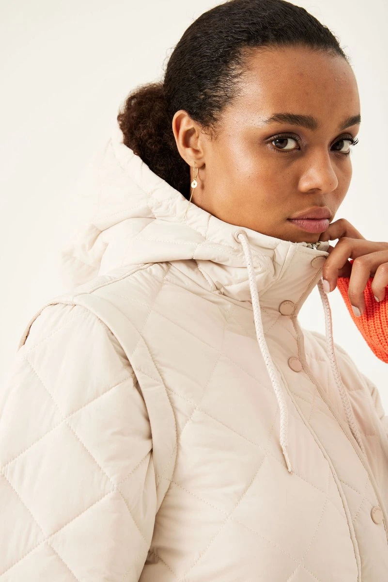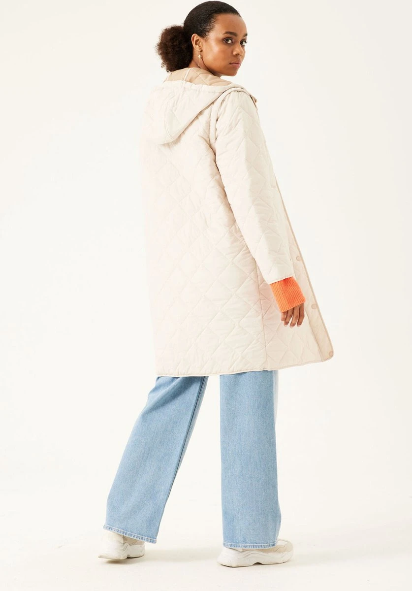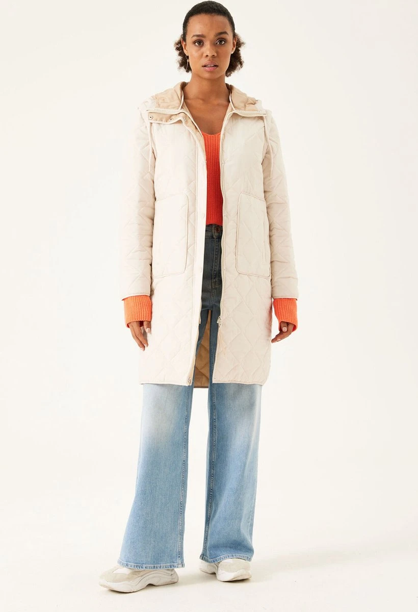 Halflange tussenjas van Garcia met doorgestikte naden. Dit waterafstotende model heeft lange mouwen en een vaste capuchon met een tunnelkoord. Dit model sluit met een rits en een flap met drukknopen. Aan de voorkant zijn twee opgestikte steekzakken geplaatst met een drukknoop. Machinewas 40°c fijne was, Niet bleken, Niet in de droger, Niet stomen, Niet strijken