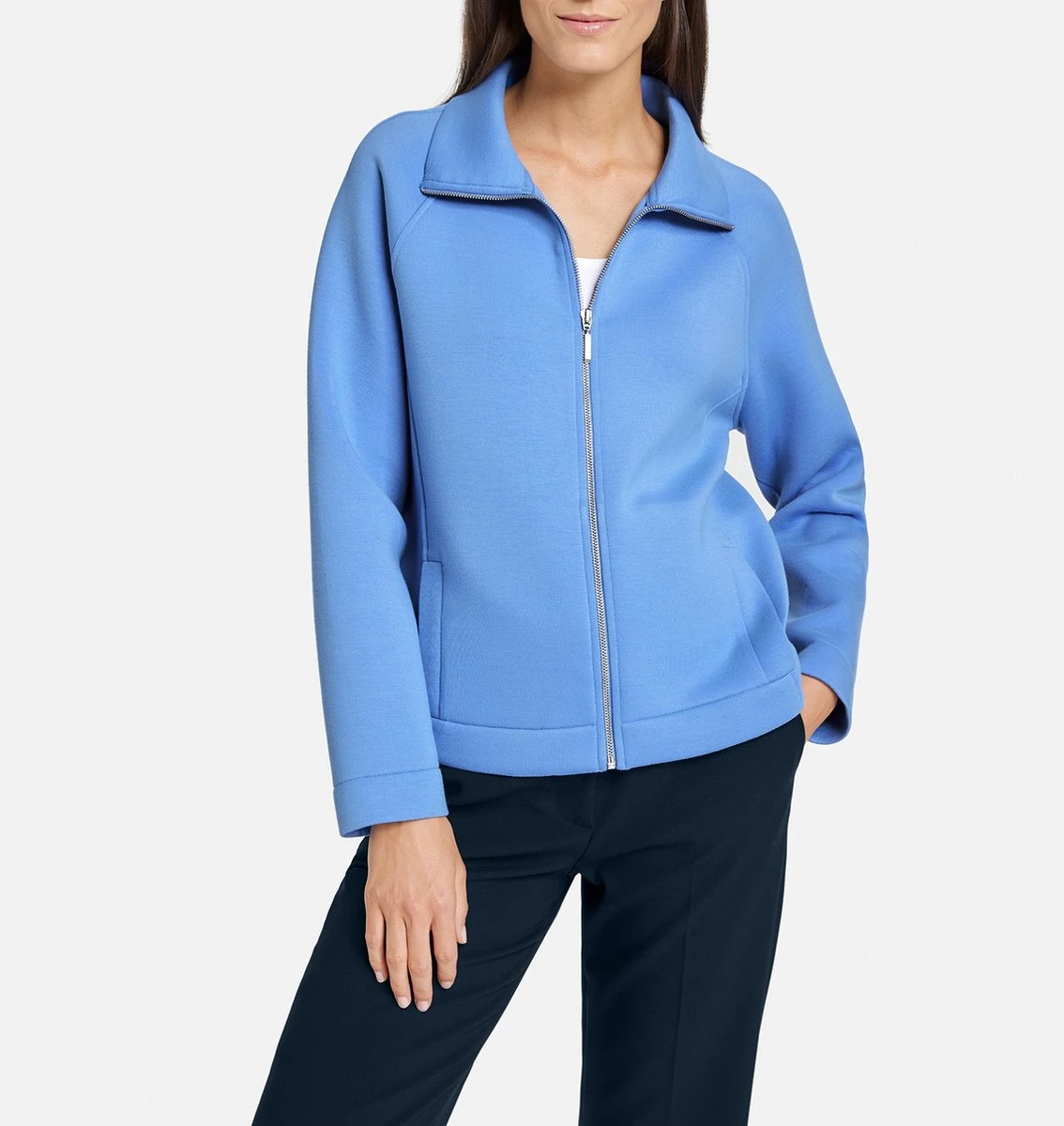 Maakt uw vrijetijds-outfit compleet en mag in geen garderobe ontbreken: met de luchtige jas met Raglanmouw heeft u een kledingstuk voor uitgebreide wandelingen gevonden. Ook op koelere dagen bent u met de opstaande kraag passend gekleed. De jersey met stretch geeft de jas een comfortabel draagcomfort. Het modieuze ontwerp wordt met nauwkeurige details compleet: paspelzakken.