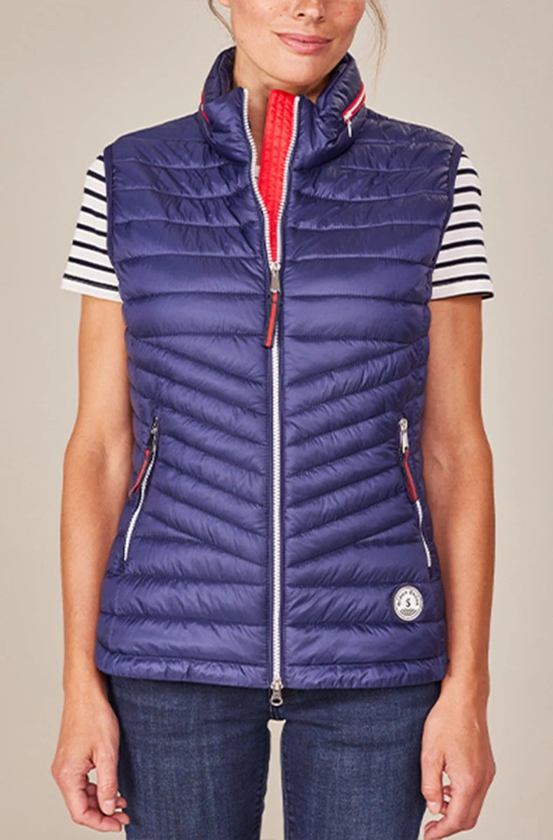De marine, rood en offwhite bodywarmer van Green Goose is de perfecte aanvulling op je zomergarderobe. Met zijn superlichte downfree constructie, houdt deze bodywarmer je koel en comfortabel terwijl je on-the-go bent.