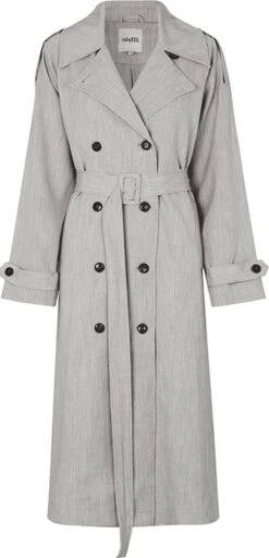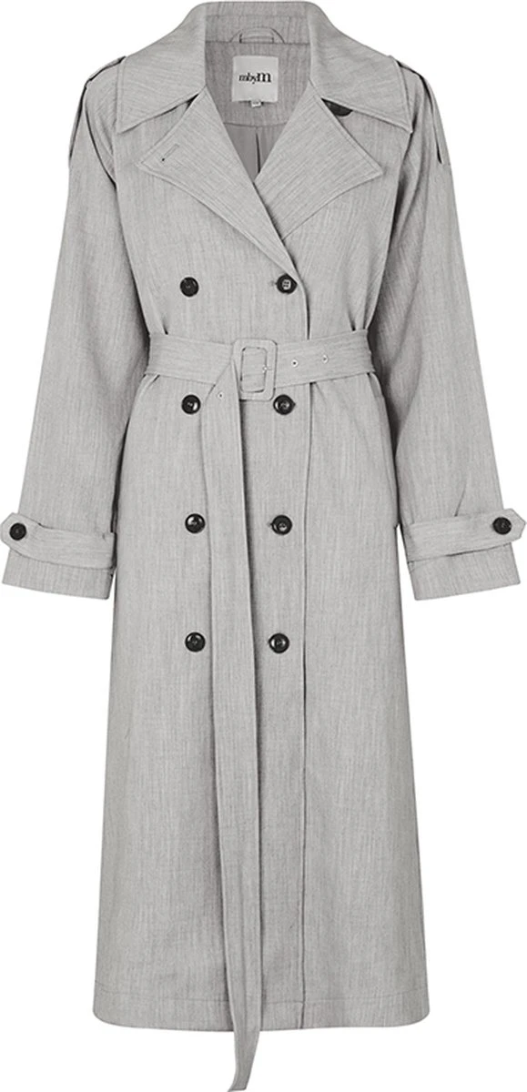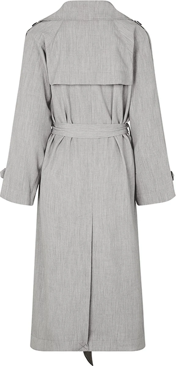 Eyecatcher, deze grijze oversized trenchcoat van het merk mbyM. De double-breasted lange trenchcoat valt losjes, heeft bandjes op de schouders en de mouwen, heeft zijzakken en een riem in de taille.