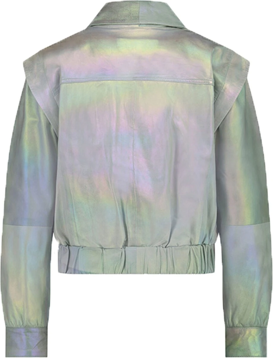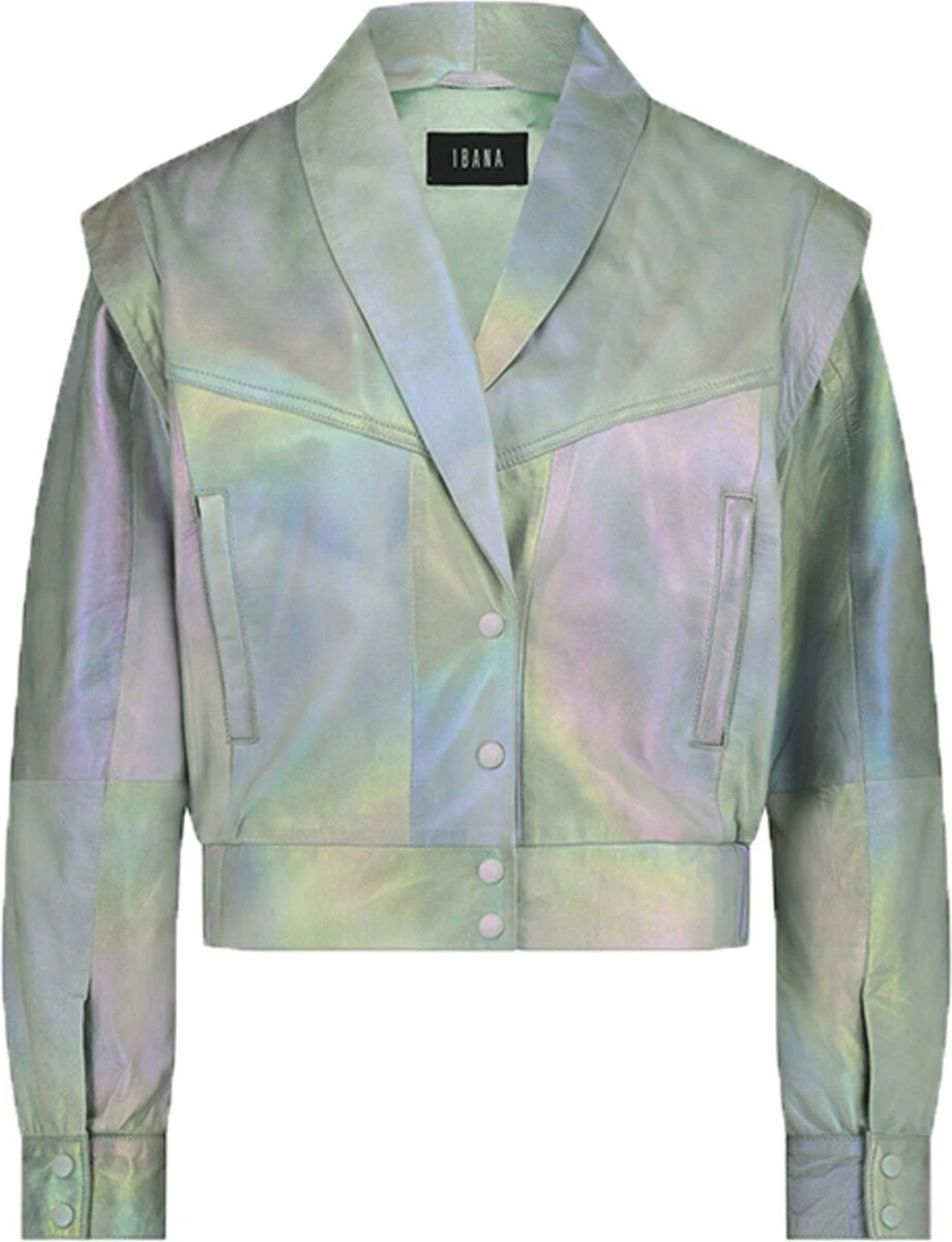 Metallic leren bikerjack met ritsen voor dames van het merk Ibana. Deze jas is uitgevoerd in metallic leer. Het model is voorzien elastiek, een v-hals met omgeslagen boord en een rits die iets uitwijkt naar de zijkant. Elastiek aan de onderkant van de jas zorgt voor soepel aan- en uittrekken van de jas.
