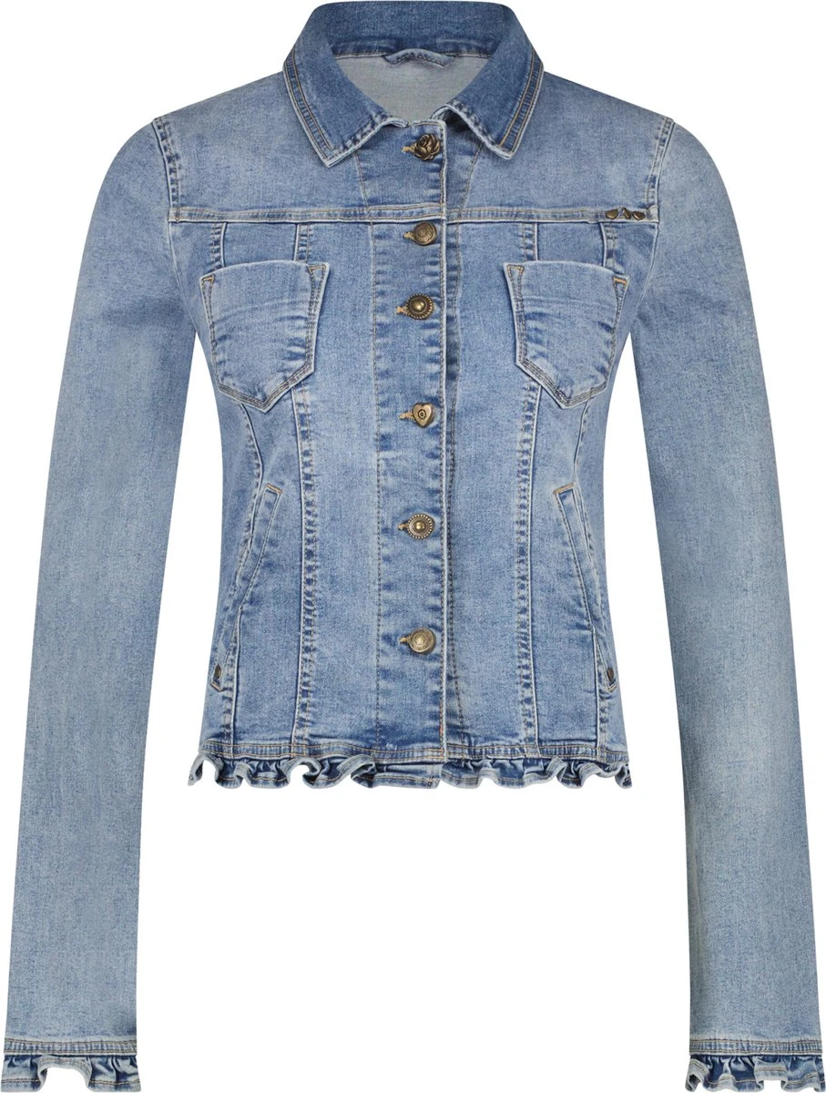 Prachtige stijlvolle denim jack van Isla Ibiza Bonita. De onderkant en mouwen zijn afgezet met een ruffled randje en valt mooi. Licht getailleerd en afgewerkt met prachtige knopen.