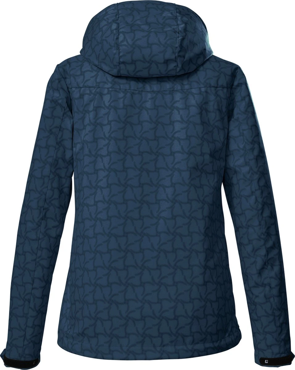 Trendy dames softshell jas van Killtec. Model: 39140. Kleur: navy. Mooie softshell jas met print. Gemaakt van 100% polyester. Winddicht, waterafstotend, waterkollom 10.000, ademend.
