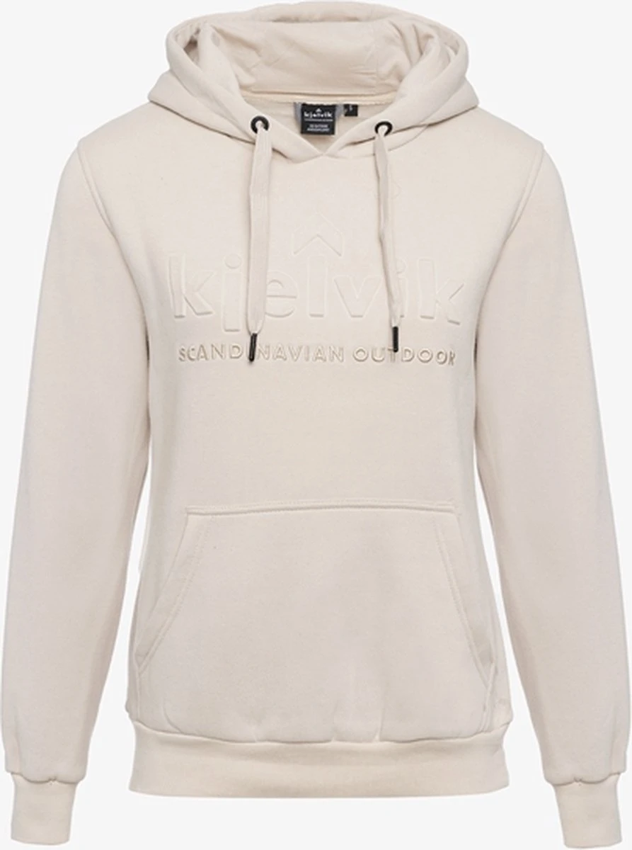 Beige dames hoodie van Kjelvik. Deze comfortabele hoodie is gemaakt van stretch materiaal. Voorzien van een capuchon met aantrekkoordjes, lange mouwen met elastische boorden en een buidelzak. De stof is ademend en sneldrogend. De hoodie is voorzien van een Kjelvik merklogo op de voorzijde. Gemaakt van 65% polyester en 35% katoen.