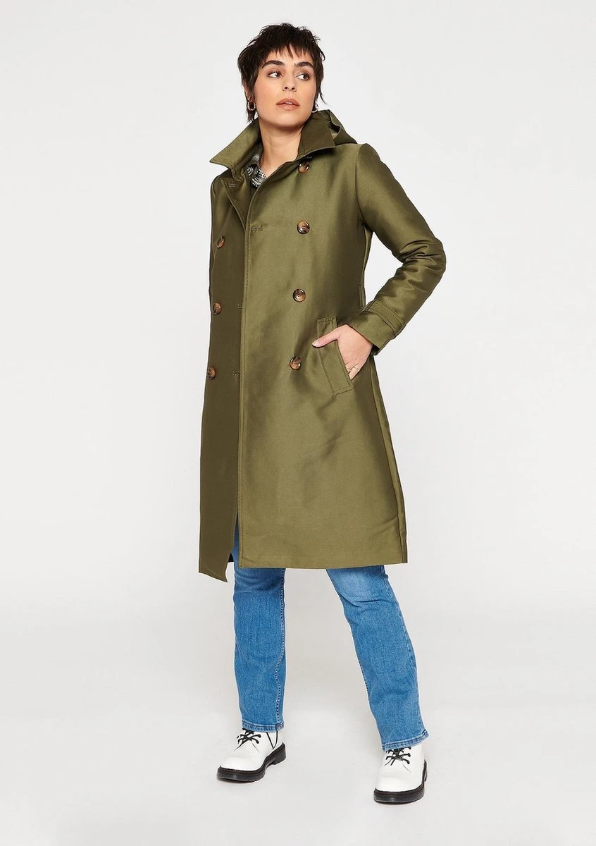 Lange trench met ceintuur rondom taille en mouwen en afneembare capuchon Glimmende stof Hout look knopen Grote steekzakken Deze trench is geschikt voor de herfst en winter Referentie: O-TRENCHY