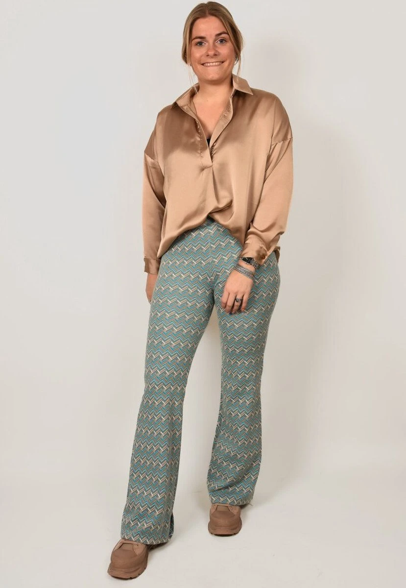 De kleurrijke Roos flared broek is helemaal hip op dit moment. De all-over print in combinatie met de hoge fit, uitlopende broekspijpen en de hoeveelheid stretch. Maakt dit de musthave broek van dit moment. Combineer erop los en jij bent klaar voor een feestje of dagje weg.