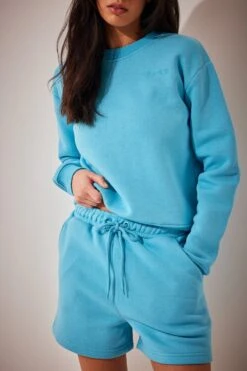 De short heeft een elastische tailleband met een voorste binding. Deze short komt in blue.