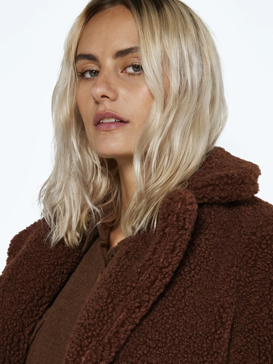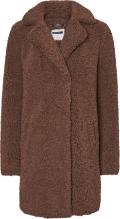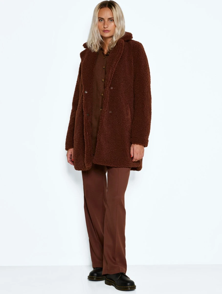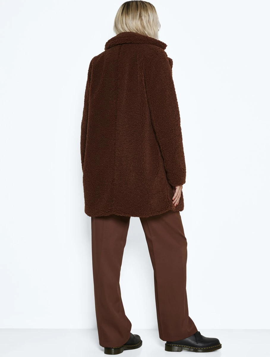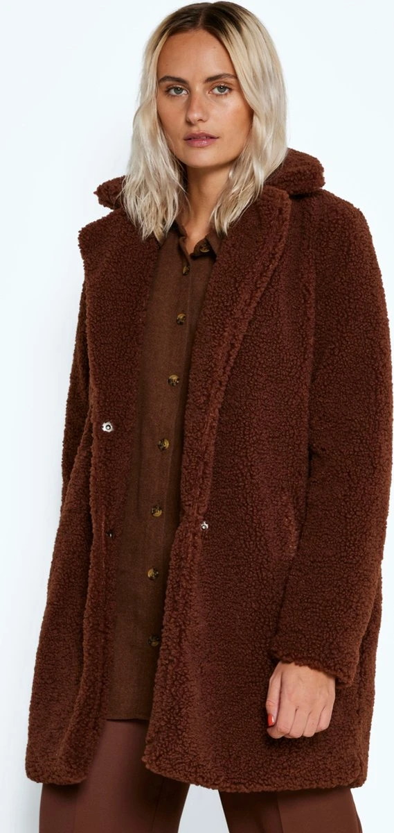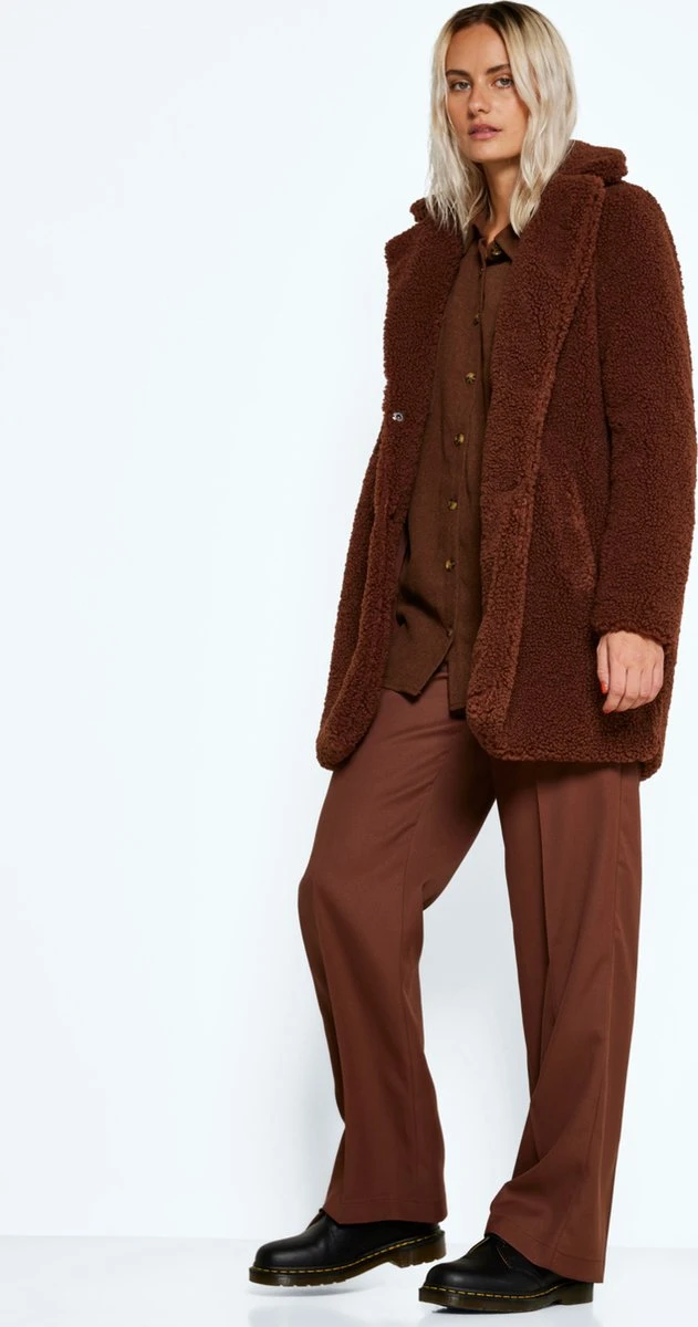 Bruine teddy jas van het merk Noisy May. Halflange winterjas met drukknoop sluiting, kraag en 2 zakken. He artikel is gemaakt van 100% polyester.