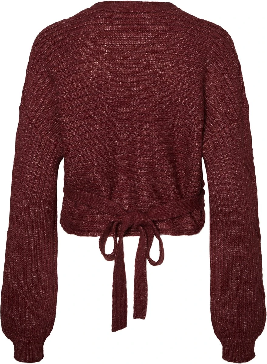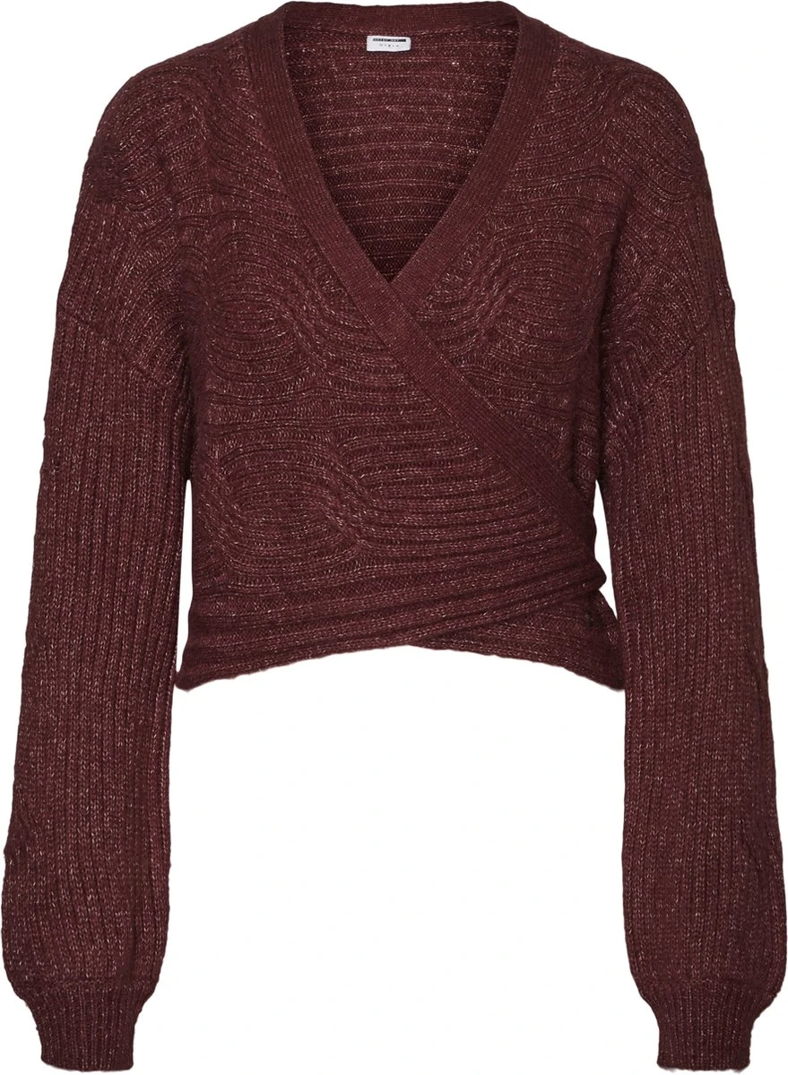 Wikkeltrui van het merk Noisy May. De overslagtrui met lange mouwen is bordeauxrood. Daarnaast wordt het gestrikt in de taille en heeft het dropped sleeves. Het artikel is gemaakt van 72% acryl, 18% polyester en 10% nylon.