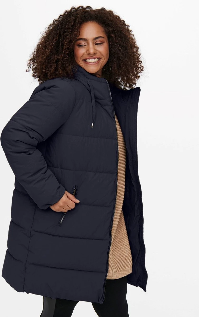 Lange donkerblauwe jas uitgevoerd met zijzakken afsluitbaar met rits, muts met aantrekkoord en aan de voorzijde afsluitbaar met zichtbare rits.
