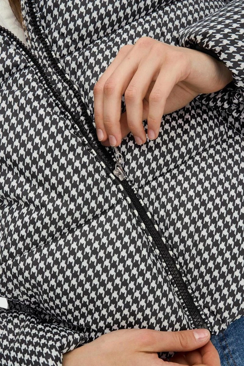 Korte pufferjas met print en hoge kraag. Gewatteerd met premium synthetische vulling en gevoerd met 100% gerecycled polyester. Ritssluiting en twee zijzakken.
