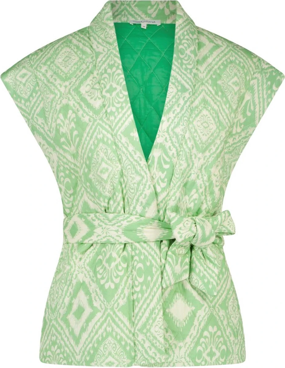 Tramontana C18-07-801 Waistcoat Cotton Ikat Stamps Print Greens. Dit is een mouwloos gilet van het merk Tramontana. Het gilet heeft een mooie groene kleur met een leuke print. Het gilet heeft een striksluiting