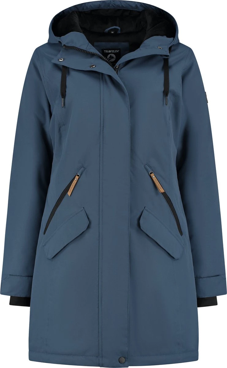 Jas Freia van Travelin’ is een lange gevoerde en waterdichte jas met capuchon. De jas heeft twee steekzakken, twee met rits afsluitbare zakken en een binnenzak. De beschermende overslag over de rits houdt de wind buiten en kan worden gesloten met drukknopen en klittenband. Verstelbare koordjes in de capuchon en onderaan de jas om de jas te dragen naar eigen voorkeur. De mouwen zijn voorzien van storm manchetten om de kou buiten te laten.