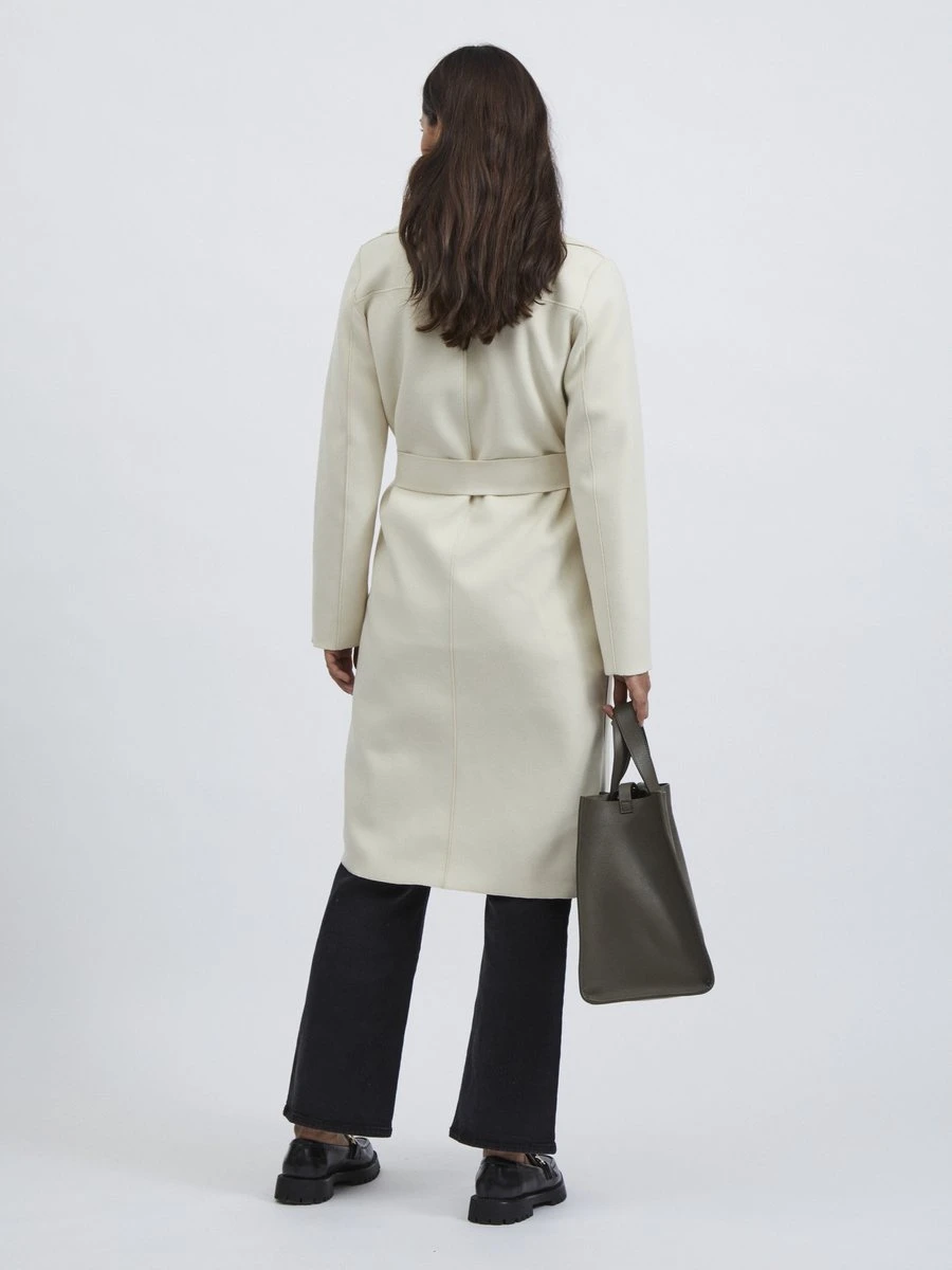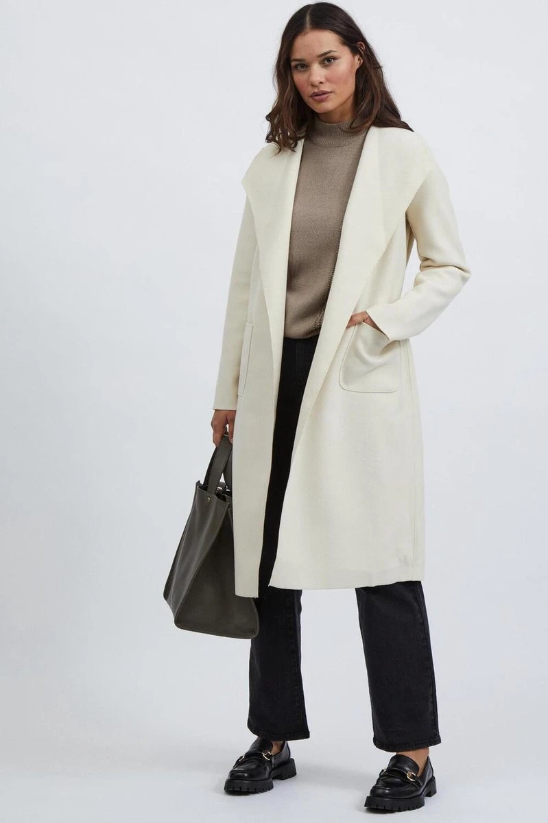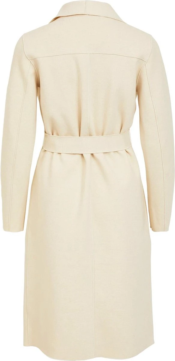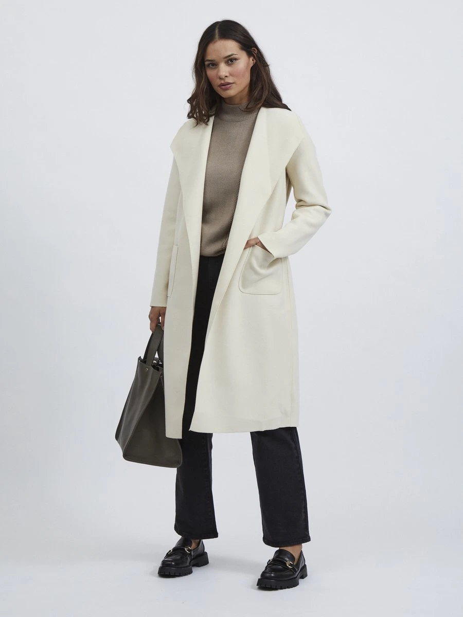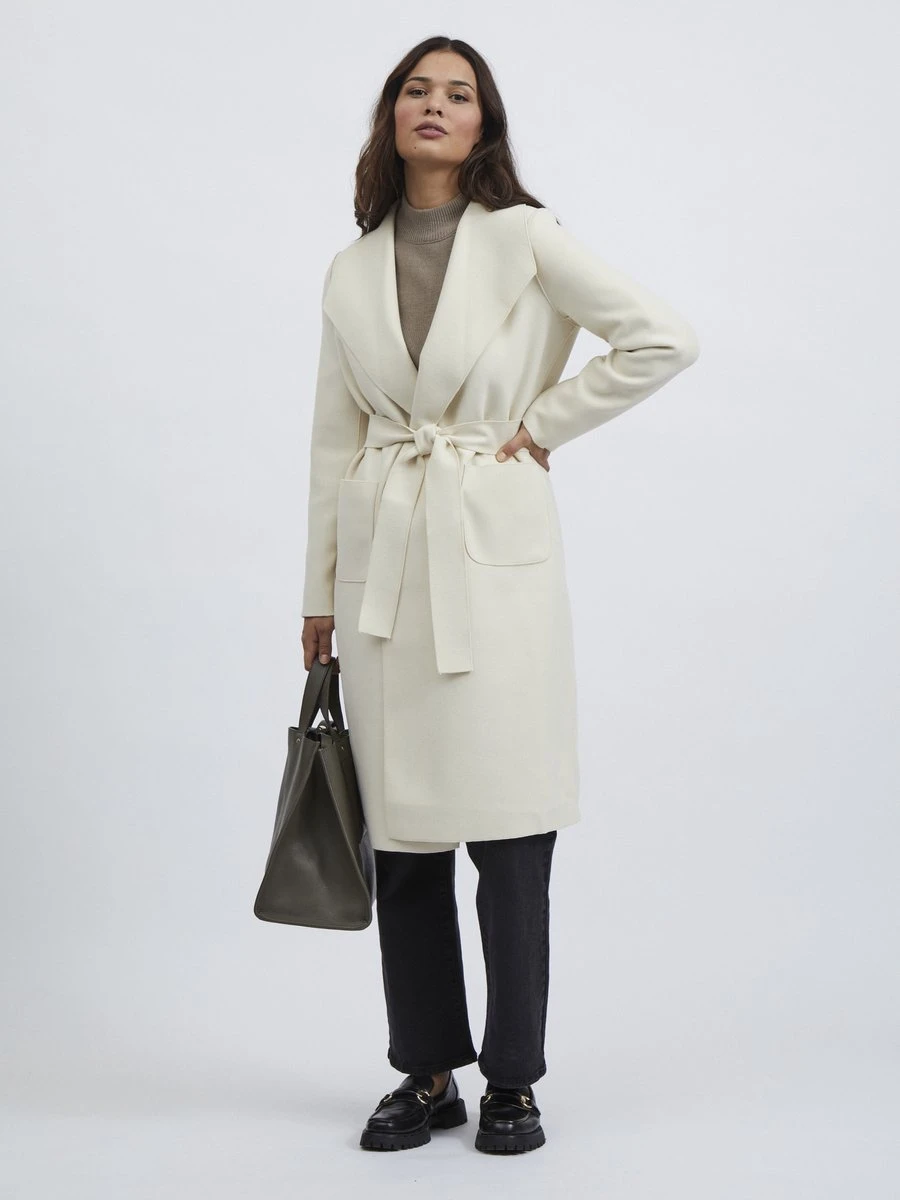 Halflange coat van Vila met lange mouwen en een reverskraag. De jas heeft twee steekzakken aan de voorkant en kan zowel open als gesloten gedragen worden door middel van het bijgeleverde strikceintuur.