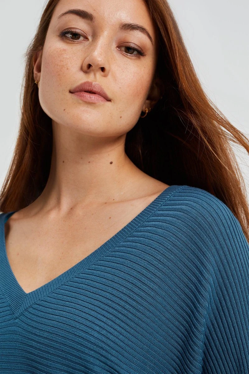 Een regular fit fijngebreide trui van een viscosemix met een ribstructuur. Het model heeft een V-hals en lange mouwen.