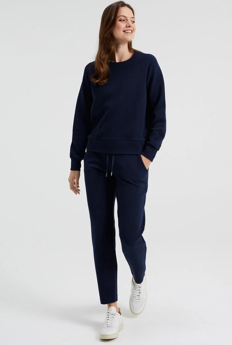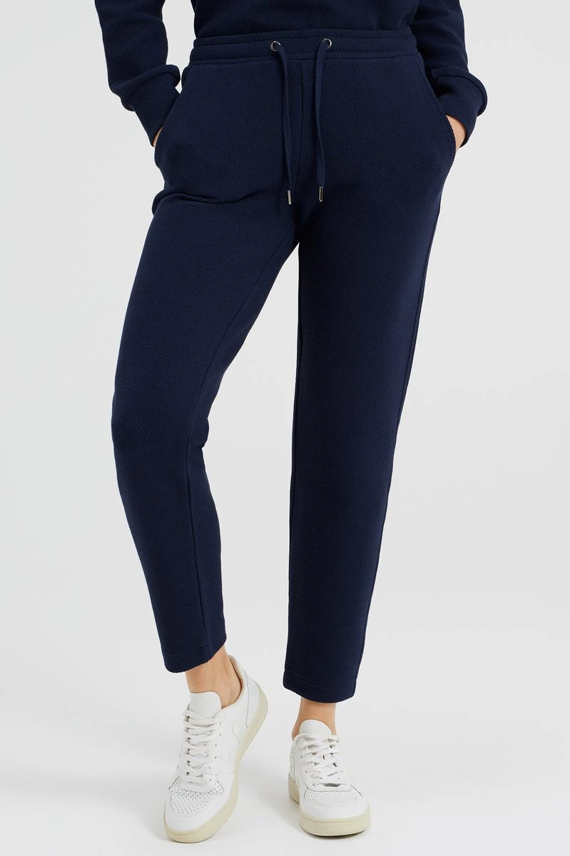Een slim fit sweatpants van een katoenmix met een structuur en twee steekzakken. Het model heeft een elastische taille met aantrekkoorden en taps toelopende pijpen.